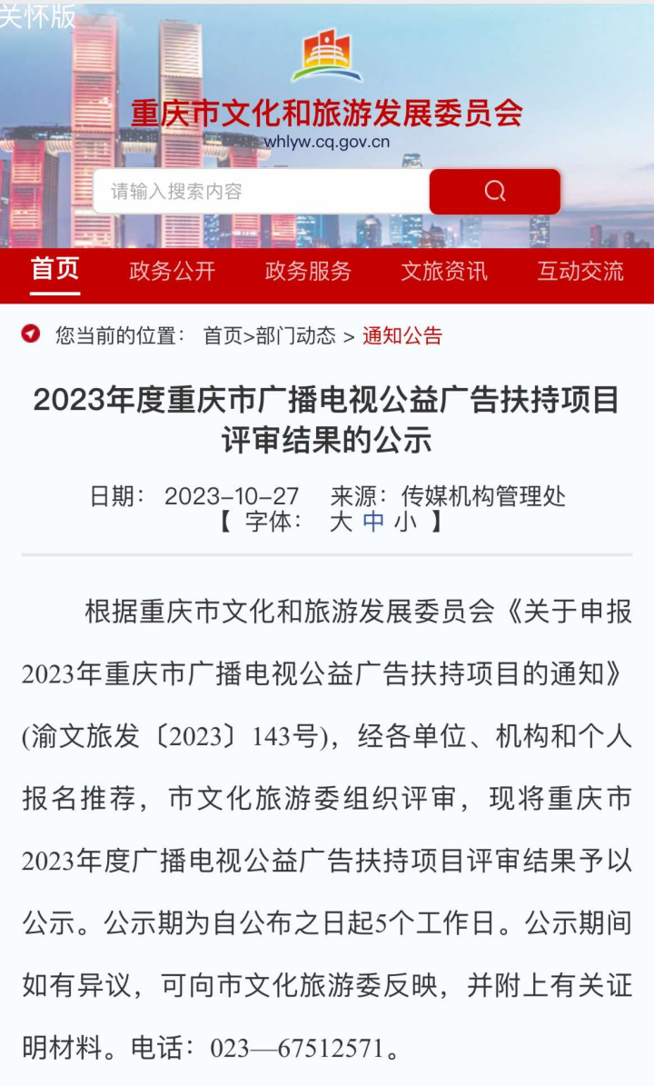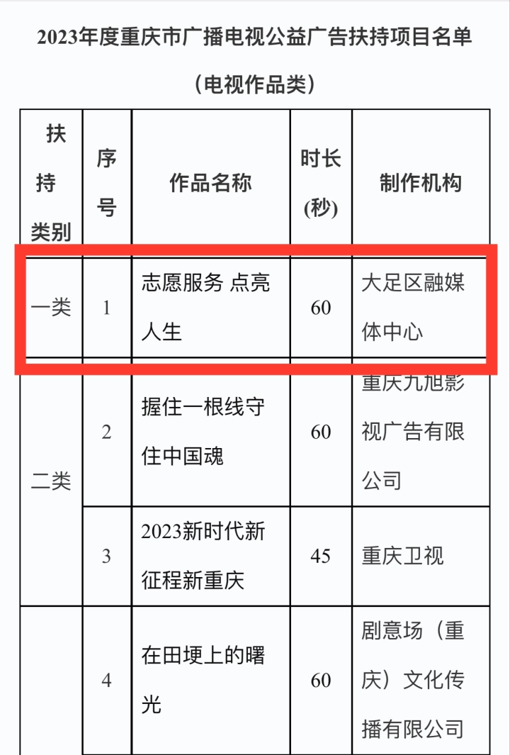 另外,10月27日,经重庆市文化旅游委组织评审,大足区融媒体中心作品《志愿服务 点亮人生》获2023年度重庆市广播电视公益广告扶持项目(一类) 。