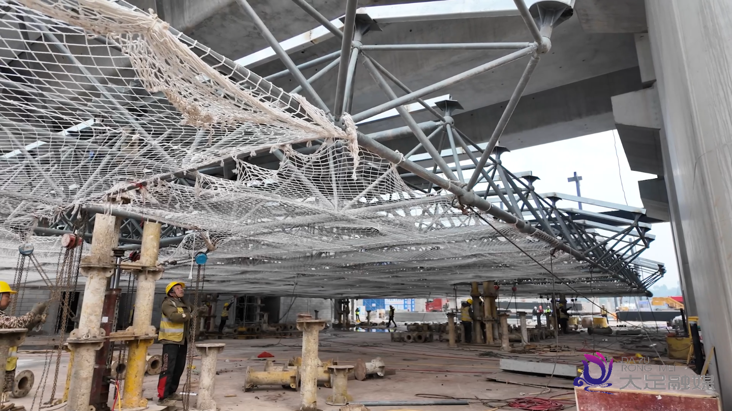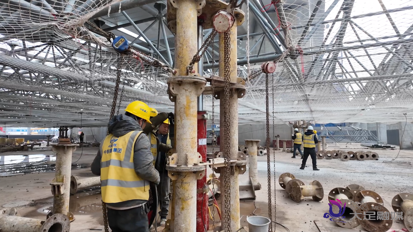 “我们现在开展的是大足石刻站站房A区网架底层作业,难点主要是液压泵的整体提升,要防止网架倾覆的风险。我们在施工的时候要调整所有液压泵的整体平衡,防止整个网架的倾覆。”成渝中线重庆段大足石刻站现场施工负责人徐浩富说。