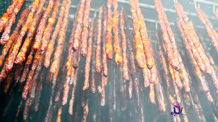 “黄良松”腌腊食品考究的工序更是在配料和熏制中体现得淋漓尽致。黄良松说,他家香肠的配料,除了注重材料品质外,配方也是自家秘制,其中的辣椒面就由近10个品种的辣椒面混合而成。熏制燃料选用存放3年的柏树枝与青冈木,通过“观火”“察烟”的经验把控火候,无火生烟慢熏2至3天,让草木清香充分渗透肉质,再经两天自然晾凉,才能成就这色泽鲜艳、肥而不腻的非遗美味。