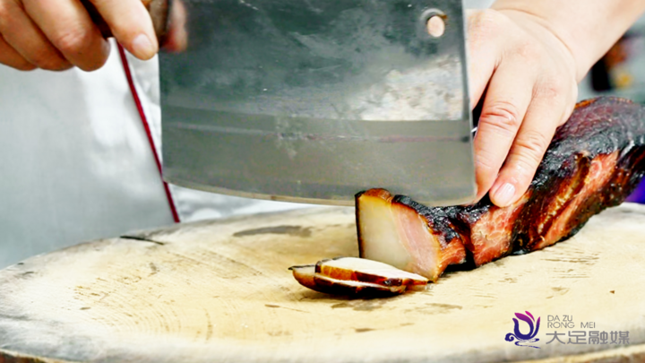 “我们家的腊味一直坚持传统技艺,每一道工序都很考究,为的是让产品口味更佳。”大足“黄良松”腌腊食品传统制作技艺第五代传承人黄良松指着案板上的肉条说,“就拿切肉来说,做香肠的肉我们会切成长短相同的细条状,这样做出来的香肠更入味。”