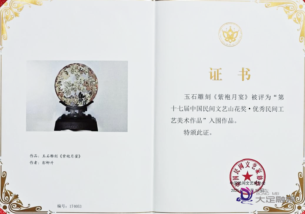 其中一项入围作品,是国家级非遗大足石雕代表性传承人彭柳升创作的玉石雕刻《紫袍月宴》。彭柳升以紫袍玉为材质,凭借精湛刀工,在玉石上雕刻出“月宴”盛景,既保留了大足石雕“精、细、雅、洁”的传统特质,又融入现代审美,让古老技艺焕发新生。