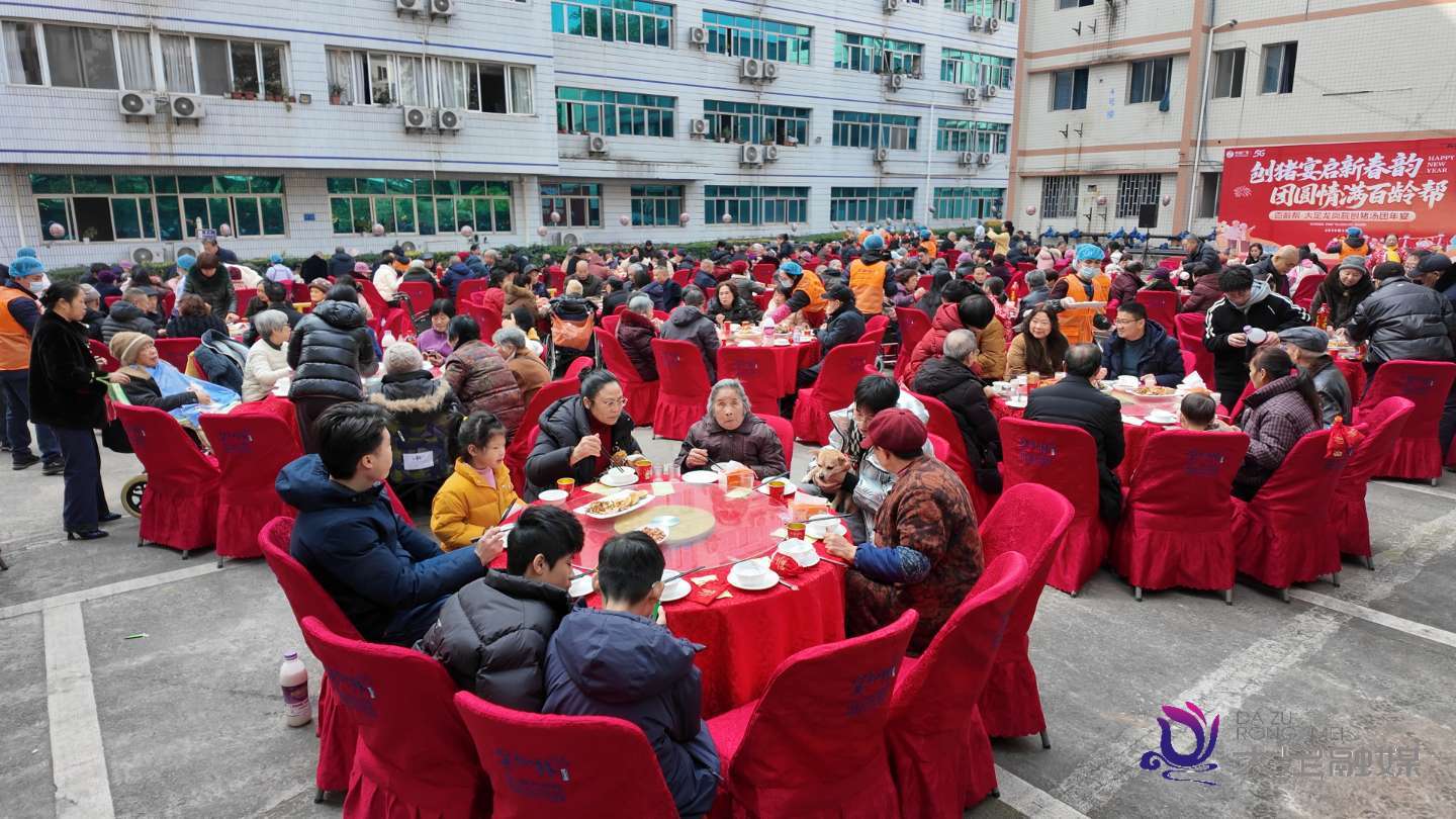 团年宴上,民族歌舞表演让现场的氛围迅速升温,热气腾腾的刨猪汤鲜香扑鼻,搭配低盐软烂的适老版菜肴,既保留了“杀猪饭”的传统风味,又兼顾了长者饮食需求。席间,欢声笑语不断,亲情、友情、邻里情交织,构成一幅团圆的温馨画卷。