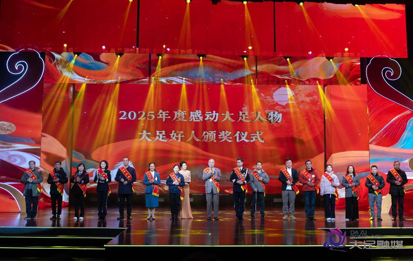 晚会现场还举行了表彰颁奖环节,对2025年度感动大足人物、大足好人,以及助力家乡发展贡献突出的商会、优秀个人、优秀企业代表等进行表彰,以榜样力量凝聚奋进共识,弘扬社会正能量。同时,大足融媒体中心官方抖音号、视频号同步对晚会进行直播,并开展直播抽奖活动,实现线上线下同频互动、全民联欢。演出在情景诗朗诵《聚力远航—奔跑2026》的豪迈誓言中圆满落幕,表达了全区干部群众在新的一年里团结一心、开拓进取,共同谱写大足发展新篇章的信心与决心。