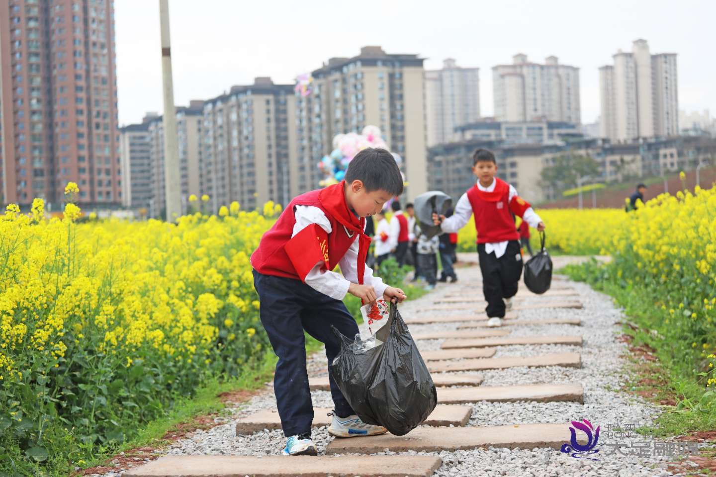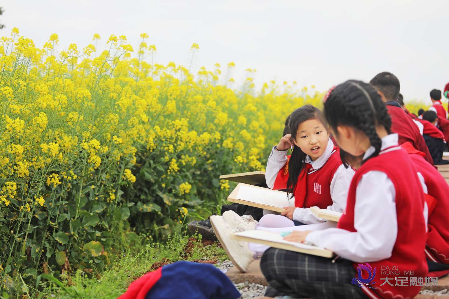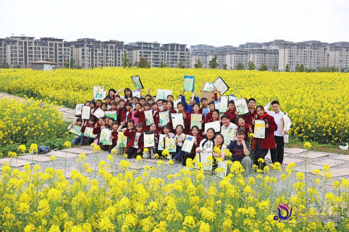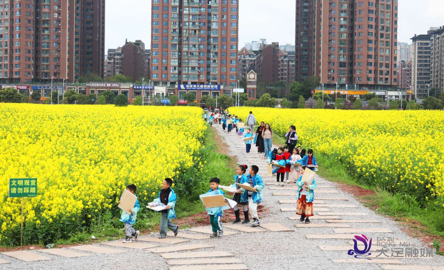 3月9日,大足区香国小学组织部分班级的同学们走出教室,来到吾悦广场旁的油菜花田,开展户外写生美术实践课。