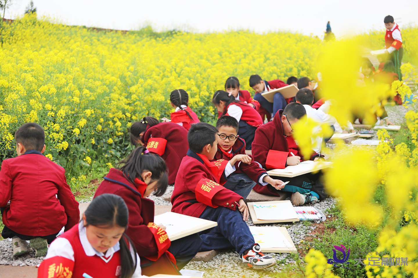 花海为幕,画板为席,笔尖流转间,一片片金黄、一抹抹新绿、一缕缕阳光,都变成了画纸上生动的风景。孩子们专注的神情、灿烂的笑脸,与花海相映成趣,构成一幅温馨动人的春日画卷。