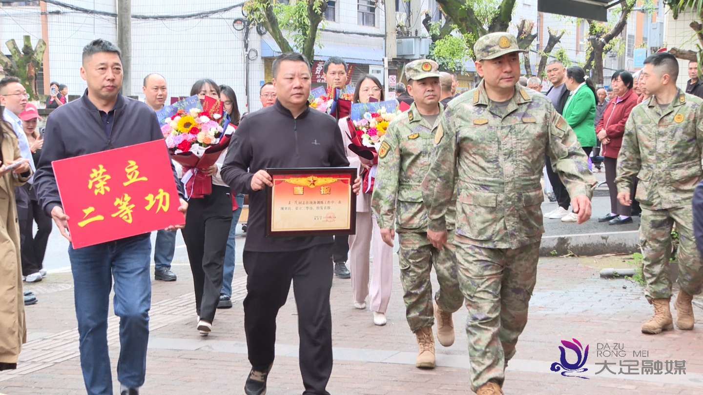4月13日,大足区人武部、区退役军人事务局组成慰问组,专程前往双桥经开区,为我区荣立个人二等功的现役军人王茂及家属送上喜报与慰问,让军人的奉献与荣耀在家乡传递。